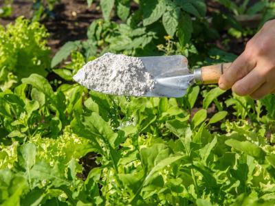 一位园丁在菜园中撒矽藻土,这是一种无毒的驱虫用品。这种磨碎的岩石粉末杀虫的方式...