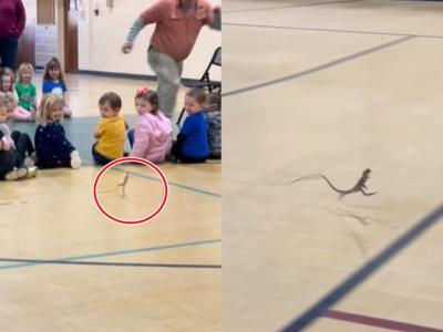 美国一只双冠蜥蜴从儿童围观中窜出快速狂