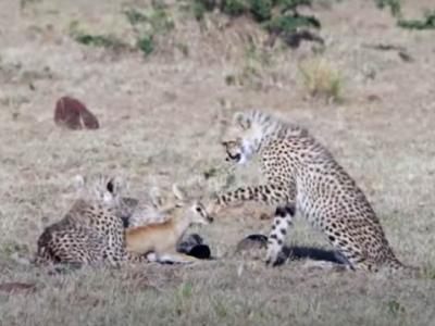 肯尼亚马赛马拉国家保护区小猎豹不知道如何吃小羚羊 又蹭又舔!(神秘的地球uux.cn...
