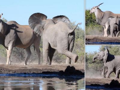 博茨瓦纳的马沙图野生动物保护区2只小象为霸占水坑想吓跑伊兰羚羊(神秘的地球uux....