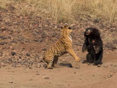 印度塔多巴老虎保护区孟加拉虎与懒熊激战(神秘的地球uux.cn报道)据ETtoday(实习...
