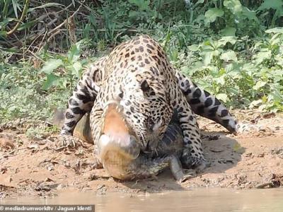 巴西潘塔纳尔湿地美洲豹咬住凯门鳄拖进沼泽地(神秘的地球uux.cn报道)据CTWANT:一...