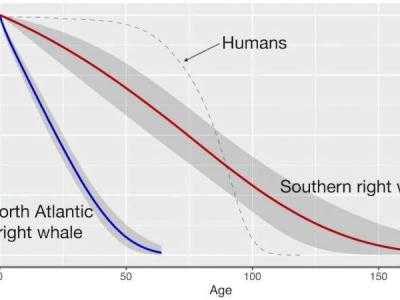 生存曲线显示,雌性露脊鲸可以活到很老,但人类正在导致北大西洋露脊鲸的死亡远低于...