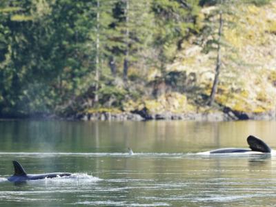 在一张分发的照片中,一只虎鲸和它的幼崽出现在不列颠哥伦比亚省泽瓦洛斯附近的一个...