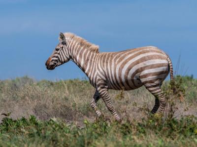 一只患有局部白化症(partial albinism)的斑马走过塞伦盖提国...