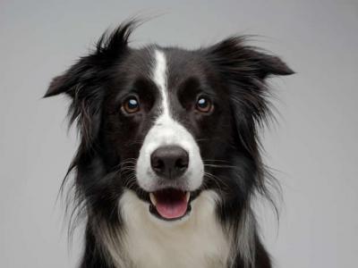 相机镜头前摆姿势的边境牧羊犬。在相似的饲养环境下...