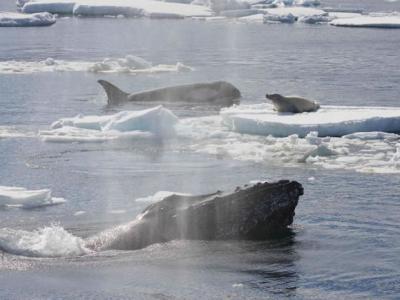 在这张于南极洲拍摄的照片中,一只虎鲸攻击一只食蟹海豹,但被座头鲸阻挡;座头鲸...