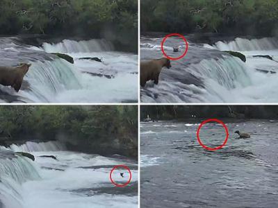 美国阿拉斯加卡特迈国家公园棕熊勇救3只被瀑布冲走的小熊 视频:美国...