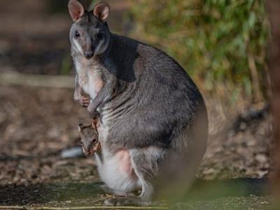 英国英格兰切斯特动物园濒危暗色沙袋鼠产下的幼崽亮相 腹袋探头看世界(神秘的地球...
