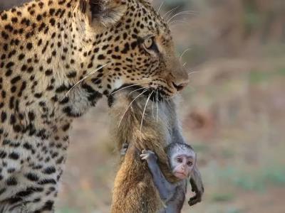 南卢安瓜国家公园母猴遭花豹猎杀咬在口中