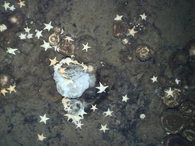 在北冰洋的一座海底山,海星聚集在一只已死或垂死的海绵上;它的身上覆盖了一层白色...