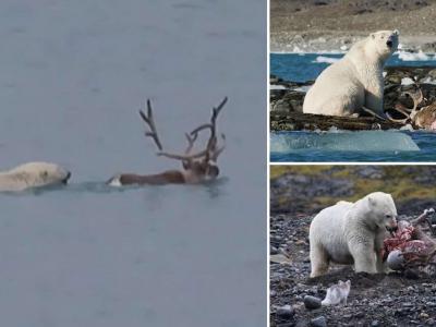 挪威斯瓦尔巴群岛北极熊猎杀一只试图游泳逃跑的驯鹿(神秘的地球uux.cn报道)据ETt...