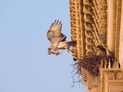 一只红尾鵟正飞离它筑在纽约高楼顶上的巢。在COVID-19封城期间,更容易在都市地区看...