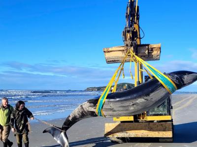 这具近17英尺长的铲齿中喙鲸尸体是从奥塔哥Taieri Mouth附近的海滩上移走的。(图片...