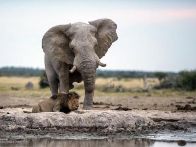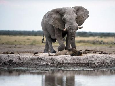 非洲雄狮忘情喝水差点被巨象踩死