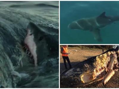 大白鲨张开血盆大口疯狂吞噬鲸尸 抹香鲸的下颚被咬至见骨,状甚骇人。 (神秘...