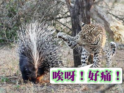 花豹伸爪触碰带刺的箭猪 起初花豹在树后虎视眈眈 花豹接近箭猪 箭猪向前...