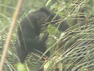 黑猩猩利用树叶吸吮棕榈树的树液 黑猩猩喝完树液后会有酒醉迹象 (神秘的地球...