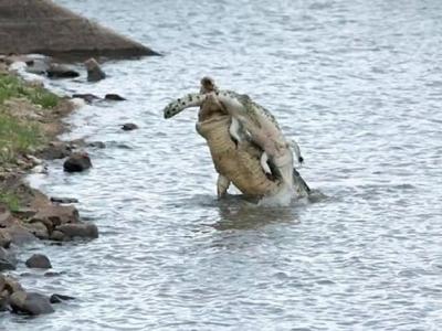 大鳄张开血盆大口,从水中衔起小鳄鱼。 大鳄衔起小鳄,将之摔来摔去。 小鳄...