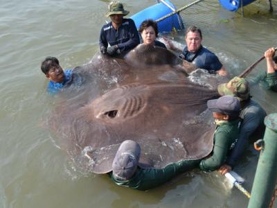 美国动物频道主持人Jeff Corwin在泰国湄公河捕获到一条重约360公斤的魔鬼鱼 (神...