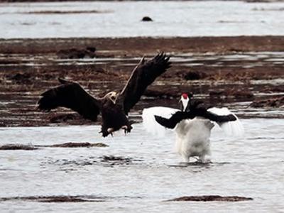 日本北海道白尾鹫偷袭丹顶鹤却被踩脚下
