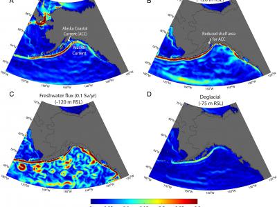 东北太平洋洋流在不同气候和海平面条件下的模拟:现代气候状态(A),LGM气候状态,...
