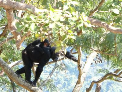 一只雌性黑猩猩背着她的婴儿,在觅食时穿梭于一棵大林木的树冠上。尽管伊萨的黑猩猩...