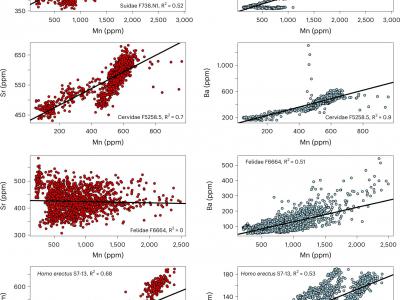 分别是 [Sr] 或 [Ba] 与 [Mn] 的散点图,用于每个动物群的代表性示例。学分:自然生...