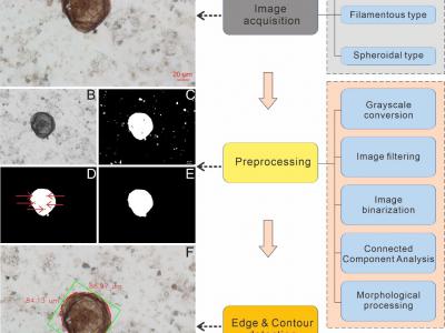 FossilMorph数字图像处理流程图丝状体类型的算法示意图FossilMorph单图处理模式(A...