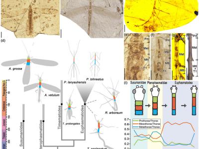 中生代发现的竹节虫化石,其中(a)粗壮近脉䗛(Adjacivena grossa)和(b)...