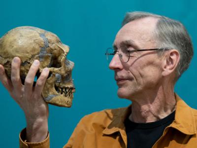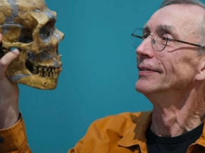 手持尼安德特人头骨复原模型的斯万特·佩博2021年3月8日,比利时皇家自然科学研究所...