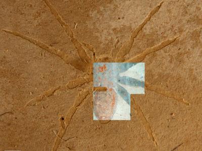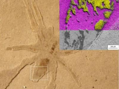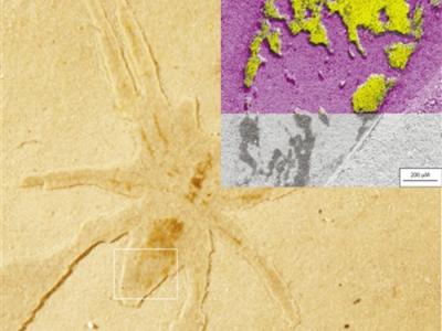 图为来自法国普罗旺斯艾克斯的蜘蛛化石。白色方框内显示了扫描电镜图像的位置,右上...