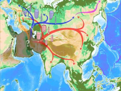 巽他、萨胡尔和西太平洋的地图,箭头显示了基因分析建议的潜在南北迁徙路线。 (图...