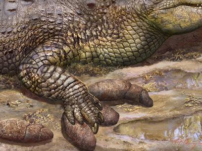 那阳始新世鳄踩在粪便上的复原图(张宗达 绘)来自那阳煤矿化石遗址的带有足迹的粪化...