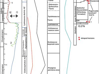 全球温度指标与四足动物多样性的关系。早三叠世四足动物分布图,及空白区可能的范围...