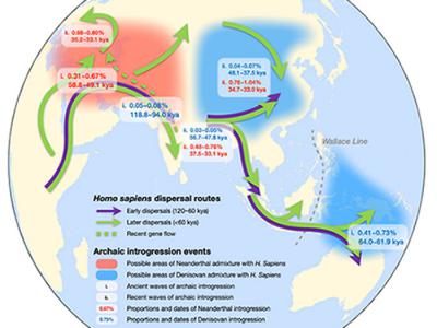 现代人类史前迁徙路线及其与远古人类的基因交流模式示意图(神秘的地球uux.cn报道)...