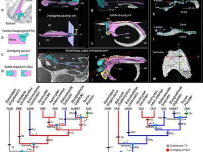 哺乳动物中耳砧骨-锤骨关节方式和相关的演化假说以及相关的特征。其中,假说n来自《...