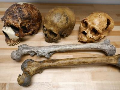 头骨化石: - 左:Amud 1,尼安德特人,55.000年前,~1750 cm3 - 中间。Cro Magnon...