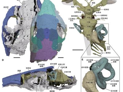 “鸭嘴兽古鱼”化石标本的CT重建,显示其颅顶甲、脑颅、脑腔和内耳骨迷路结构。中国...