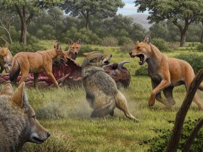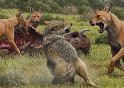 在晚更新世的北美洲某处,一群恐狼正在啃食捕杀野牛,旁边两只灰狼希望可以蹭到一些...