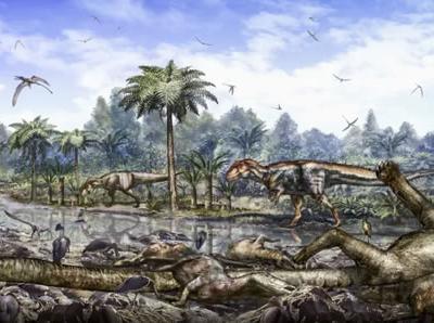 晚白垩纪时期,一只成年矮暴龙(左)与两只幼年霸王龙对峙,一只亚成年霸王龙在远处...