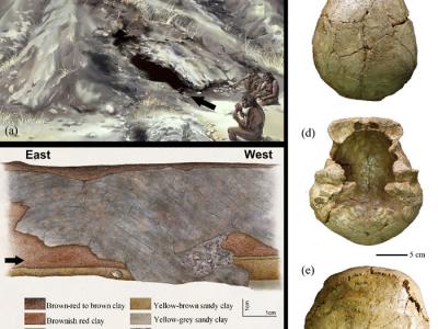 和县人头骨化石及出土洞穴、地层信息(郭肖聪、吴秀杰供图)和县直立人头盖骨表面的...