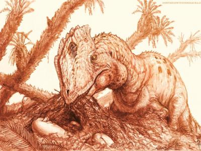 这幅重建图显示一只成年魏氏双脊龙(Dilophosaurus wetherilli)正在照料一窝孵化中...