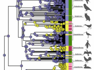 鸟类换羽行为的演化历程。紫色:顺序换羽;黄色:非顺序换羽;绿色:稳定的飞行能力...