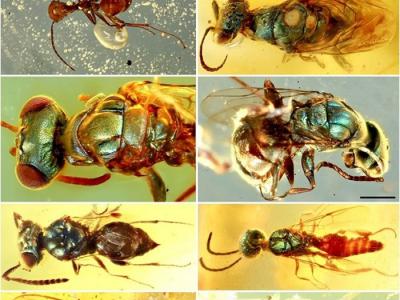白垩纪缅甸琥珀中多样的具金属色彩结构色的昆虫青蜂化石身体表...