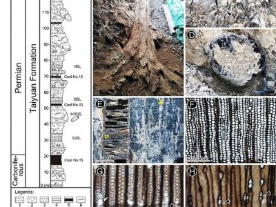 阳泉地区太原组地层柱状图(A)和巨型科达植物茎干形态(B-D)...
