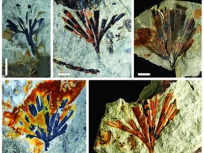 湖北秭归的银杏植物化石荧光显微镜下,银杏化石叶片的角质层气...