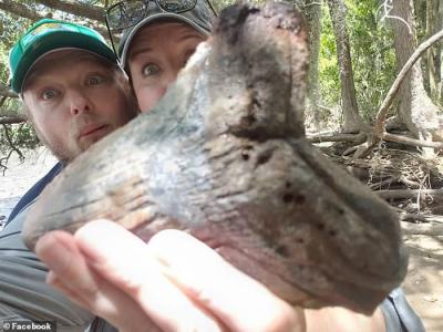 美国南卡罗来纳州夫妇在查尔斯顿郊外斯通河发现至少三百万年历史的巨齿鲨牙齿化石(...