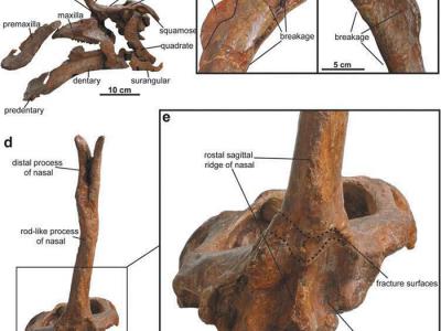 棘鼻青岛龙头骨,显示其特殊的“棘鼻”状头饰以及鼻骨根部断裂处棘鼻青岛龙正型和副...