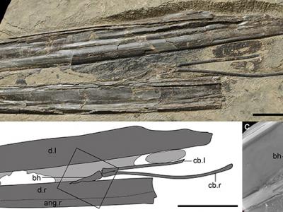 第一件保存有基舌骨的翼龙化石(IVPP V 14189),比例尺分别为50 mm,50 mm和10 mm...